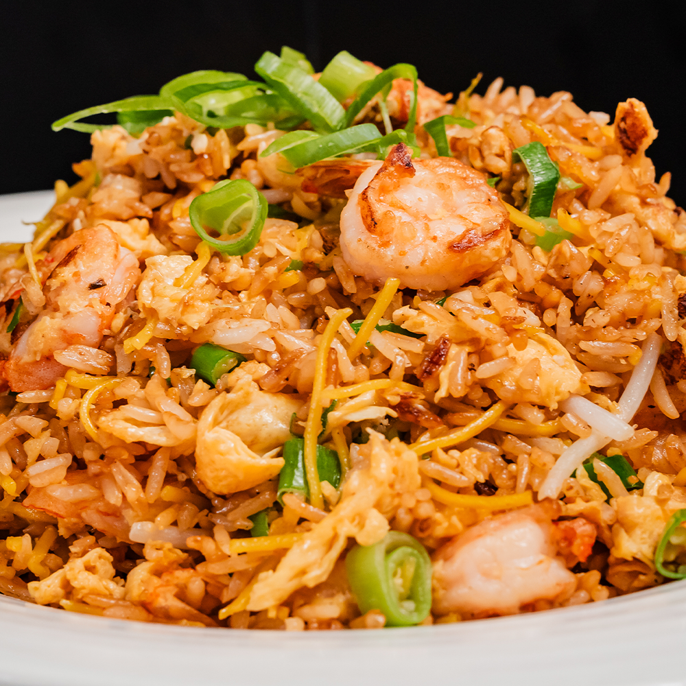 Langostinos, huevo, arroz, fideos, cebollino, brotes de soja y salsa de soja salteado al wok