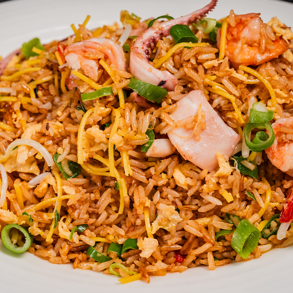Mariscos, huevo, arroz, fideos, cebollino, brotes de soja y salsa de soja salteado al wok