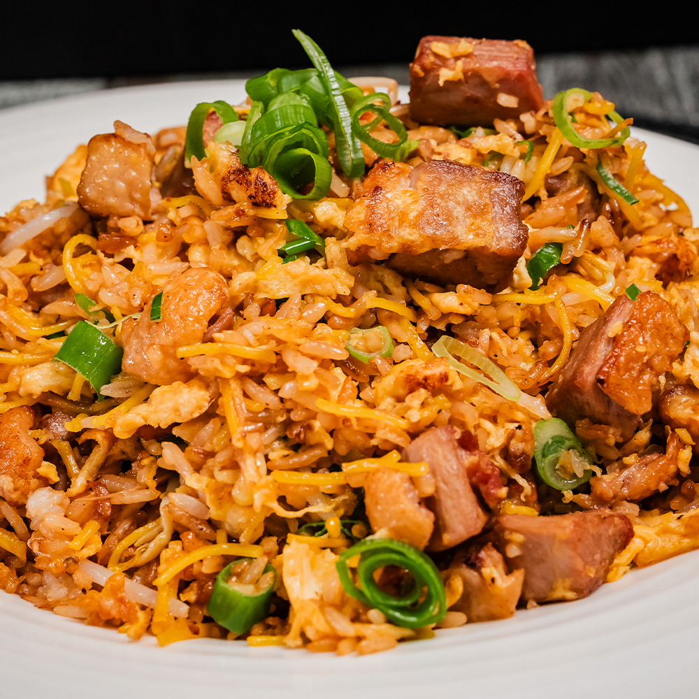 Pato, huevo, arroz, fideos, cebollino, brotes de soja y salsa de soja salteado al wok