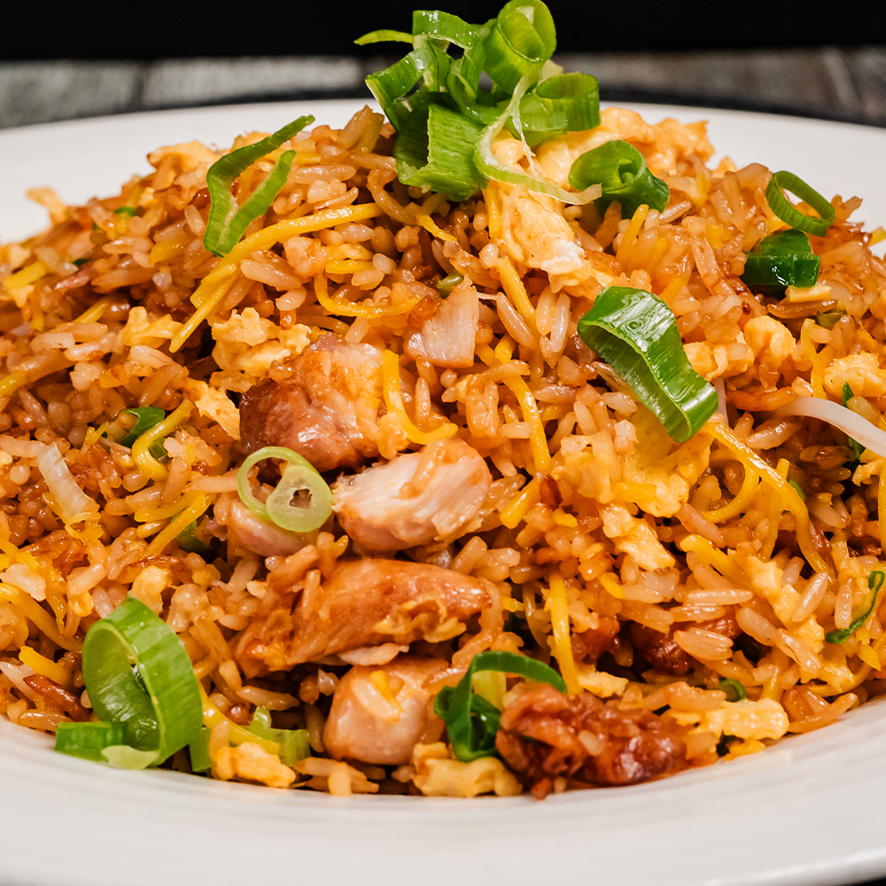 Pollo, huevo, arroz, fideos, cebollino, brotes de soja y salsa de soja salteado al wok