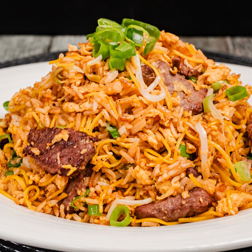 Ternera, huevo, arroz, fideos, cebollino, brotes de soja y salsa de soja salteado al wok