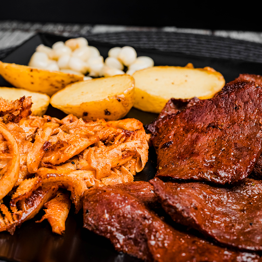 Trozos de corazón y librillo de ternera aderezado con ají panca y acompañado de patatas doradas a la parrilla con ají carretillero