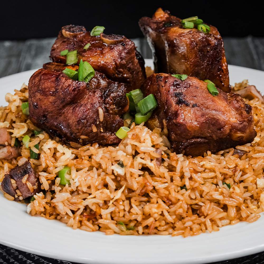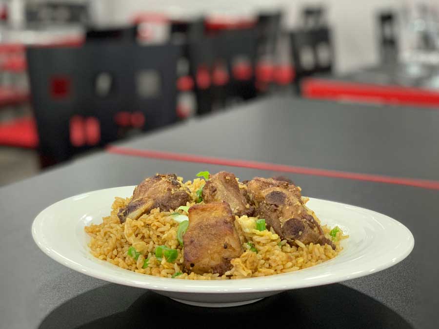Costillas de cerdo, arroz, huevo, cebollino y salsa de soja salteado al wok