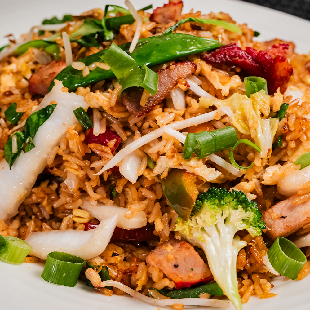 Arroz chaufa de cerdo y verduras variadas saltadas al wok