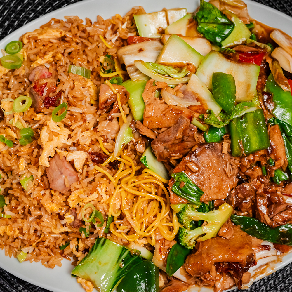 2 en 1 de tallarines con cerdo y arroz chaufa de cerdo