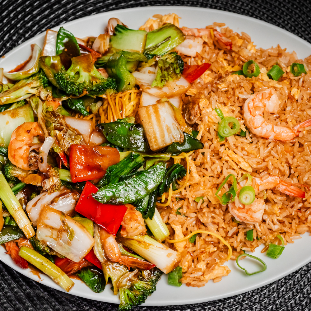 2 en 1 de tallarines con langostinos y arroz chaufa de langostinos