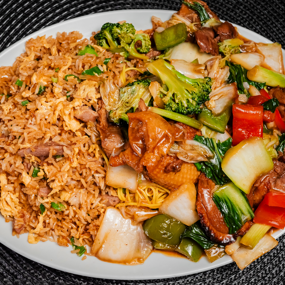 2 en 1 de tallarines con pato y arroz chaufa de pato