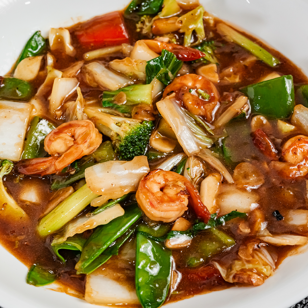 Langostinos, verduras chinas, ajos y salsa de soja salteado al wok