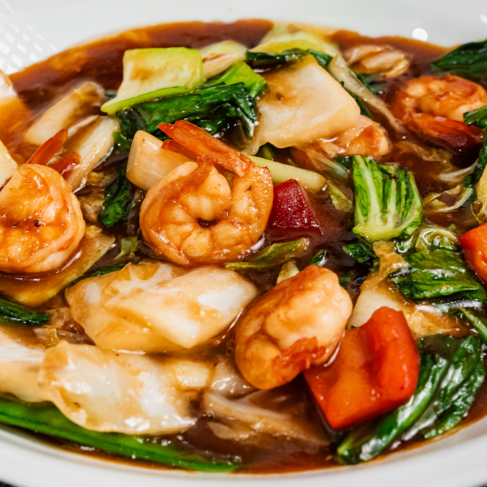 Langostinos, verduras chinas y salsa de ostras salteado al wok