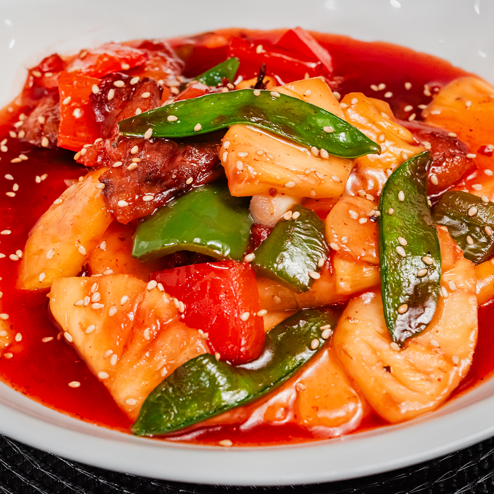 Pato asado, piña, verduras chinas y salsa agridulce salteado al wok