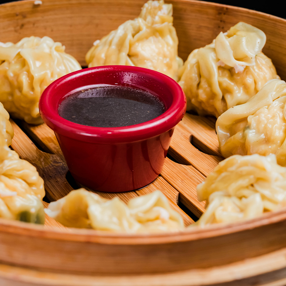 Bocaditos al vapor, relleno de langostinos y setas shiitake acompañado de salsa de soja