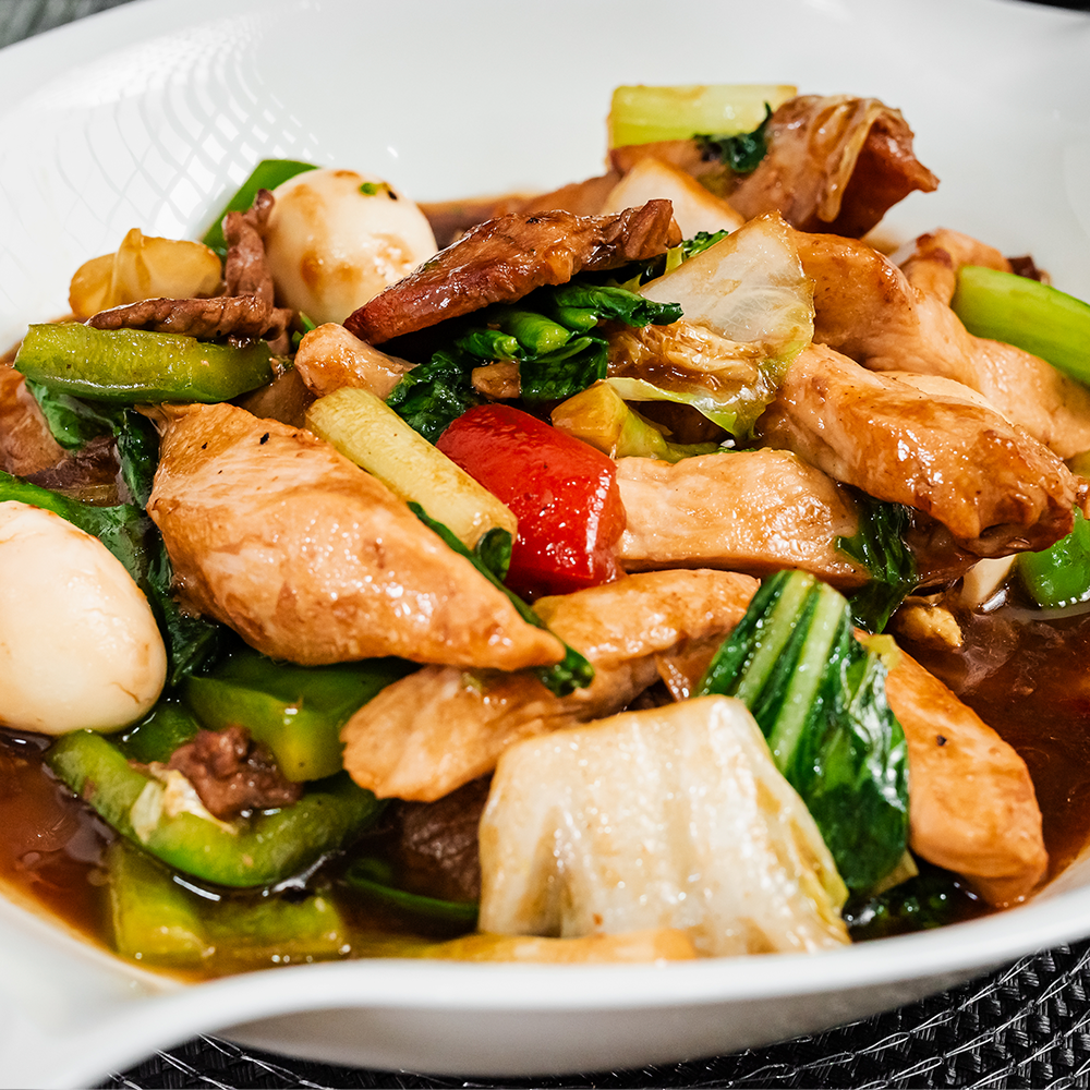 Variedad de carnes, verduras chinas, algas marinas y salsa de ostras salteado al wok