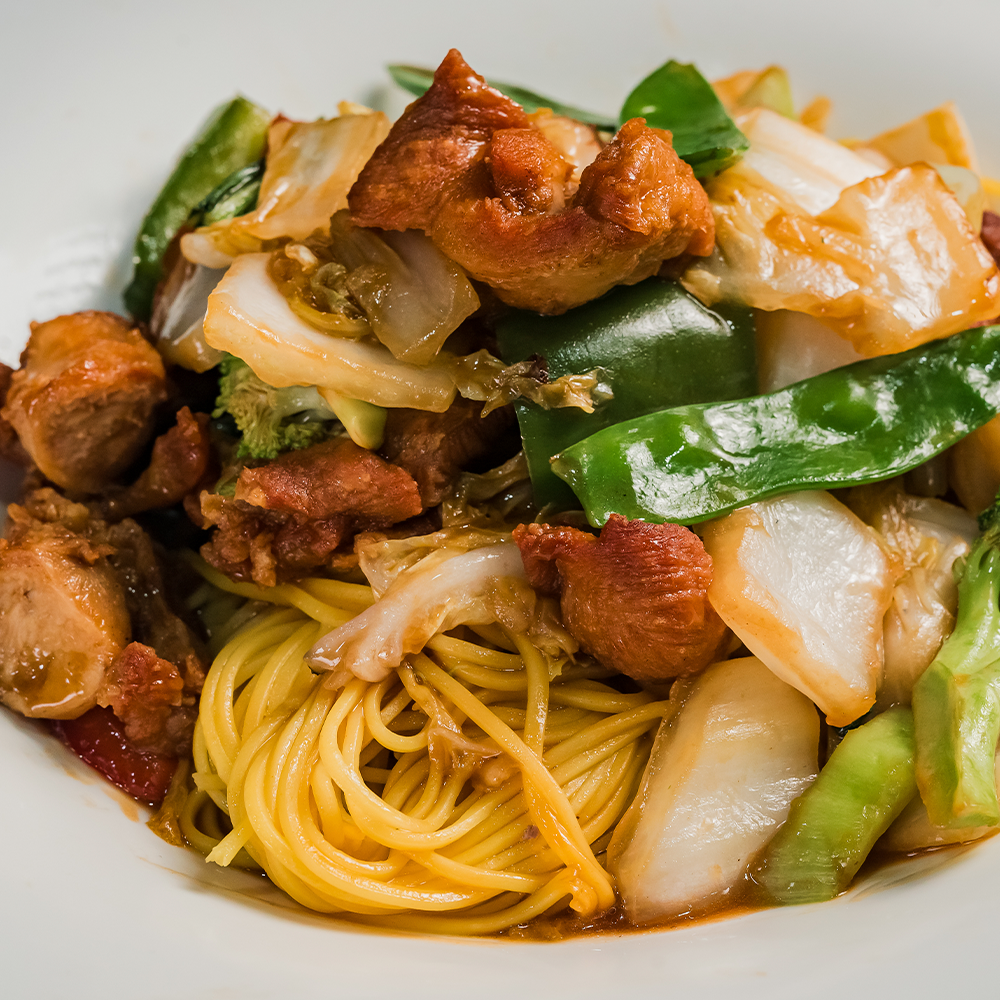 Pollo en trozos, fideos, verduras chinas, salsa de ostras y salsa de soja salteado al wok