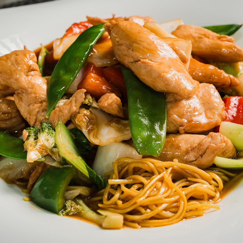 Pollo, fideos, verduras chinas, salsa de ostras y salsa de soja salteado al wok