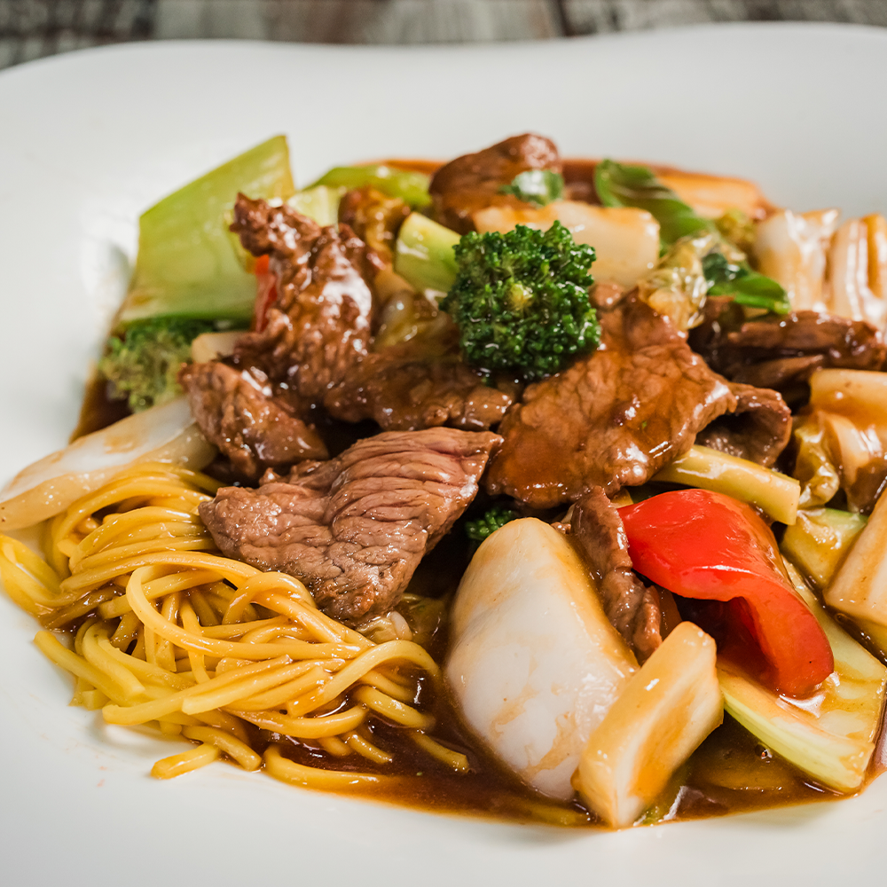 Ternera, fideos, verduras chinas, salsa de ostras y salsa de soja salteado al wok