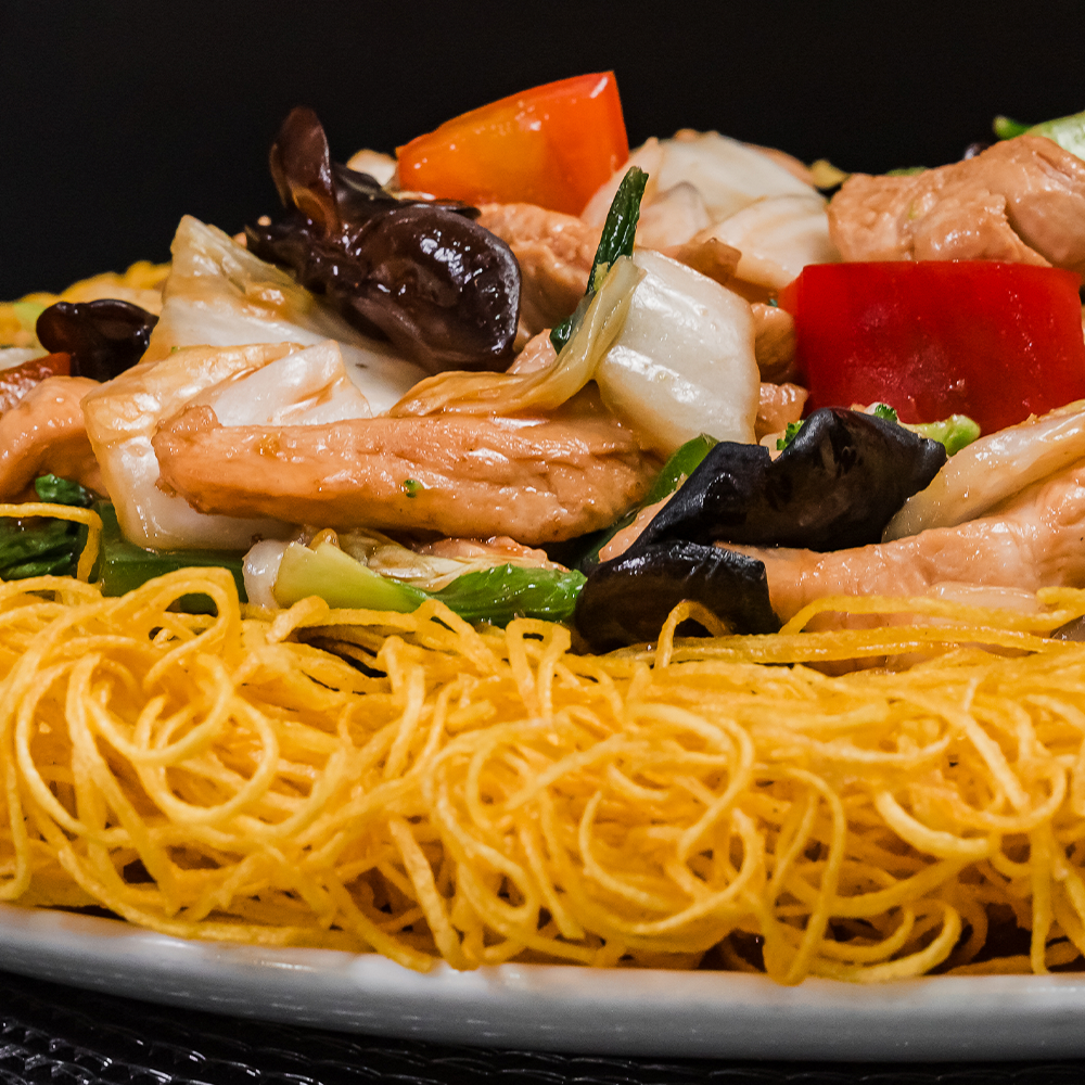 cama de tallarines fritos montados con pollo, verduras chinas, salsa de ostras y salsa de soja salteado al wok