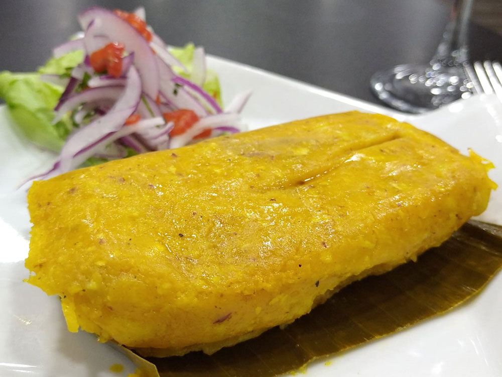 Maíz molido relleno de cerdo acompañado de una ensalada de cebolla y pan