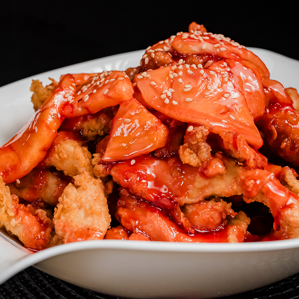 Pollo en trozos rebozados, semillas de sésamo y salsa agridulce acompañado de arroz chaufa